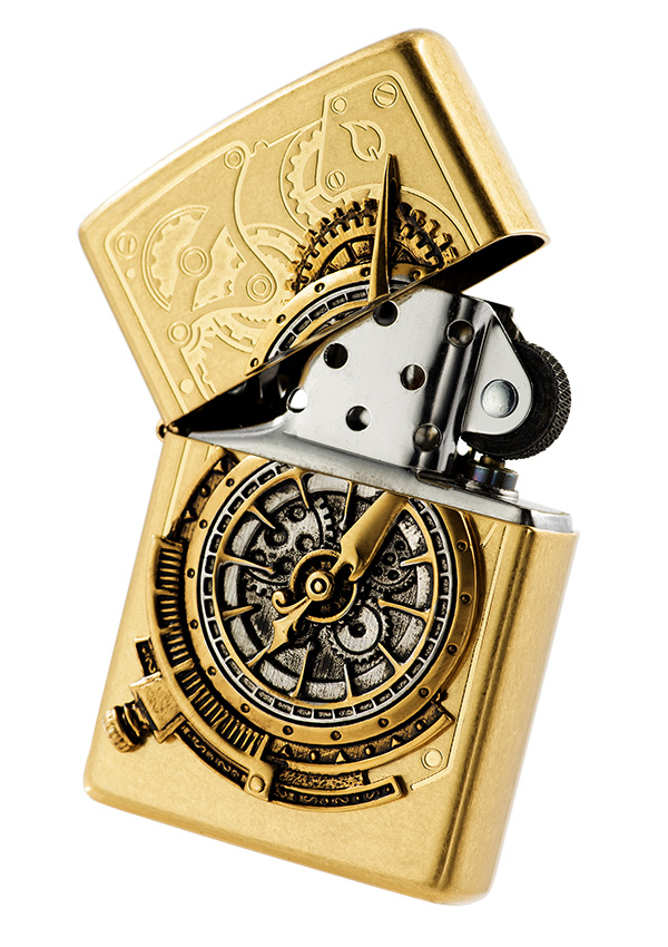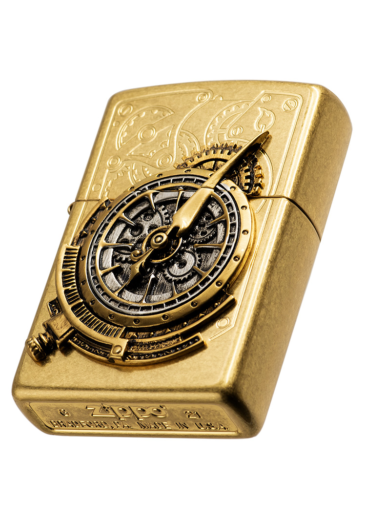 此款整個表面,包括側面和底部,皆用一種特殊的介質中滾動打磨,具有隨意的“仿舊”外觀。正面採用雕刻技術設計了一些蒸氣龐克風格的齒輪圖形,搭配上貼章技術將整個蒸氣龐克風格的齒輪懷錶呈現出來。簡單又精緻展現蒸氣龐克的獨特魅力。